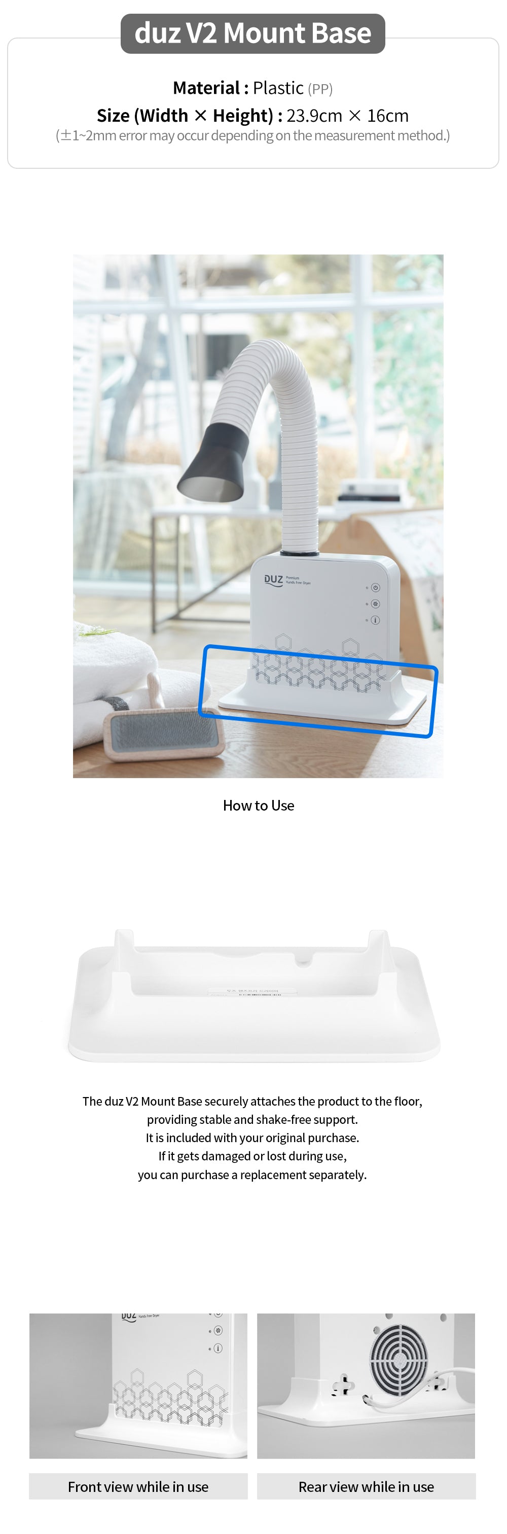 This sturdy base stand is designed exclusively for the duz Hands-Free Dryer V2.