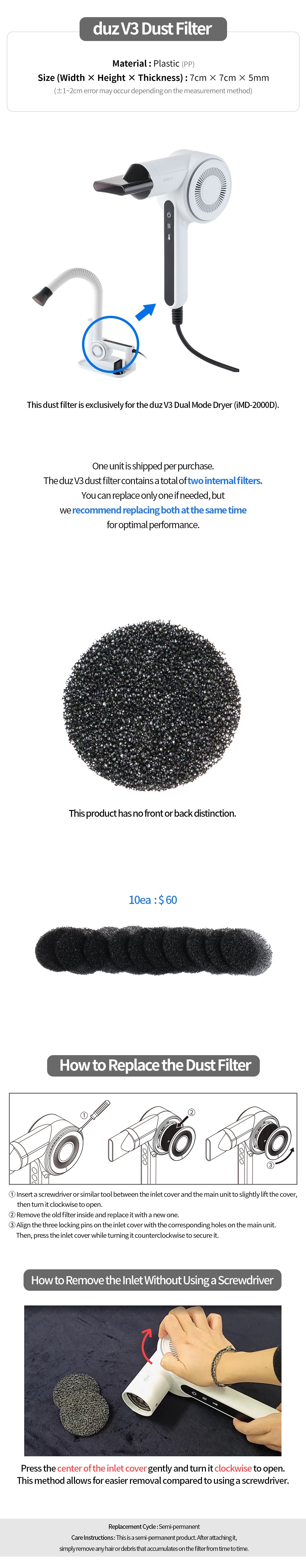 Keep your duz V3 Dryer clean and running smoothly with this 10-pack of dust filters.